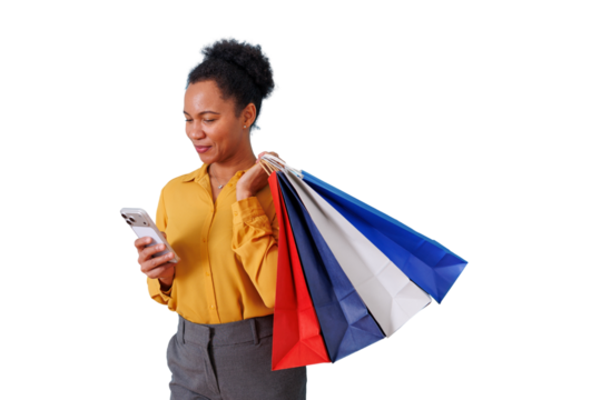 Happy woman, phone and shopping bag for deal, discount or sale isolated on a transparent PNG background. Female person or shopper smile with mobile smartphone for online payment, banking or purchase