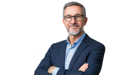 A well-dressed man with glasses and a beard, exuding confidence and professionalism.