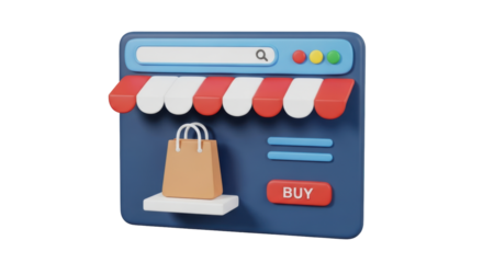 3D Online shopping cart icon on laptop screen with store awning on transparent background