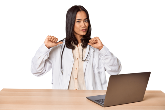 Young Filipino doctor with laptop in studio feels proud and self confident, example to follow.