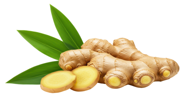 Ginger Rhizome Radiance Golden root slices and verdant leaves on onyx backdrop