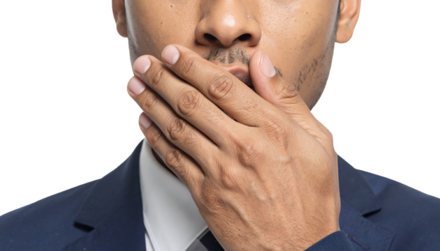 Portrait of scared young Asian man covering mouth with two hands isolated on transparent background