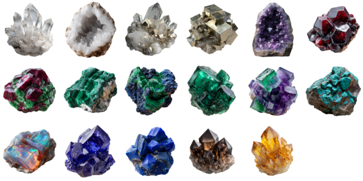 Collection of 17 raw gemstone crystals and natural minerals isolated on transparent background