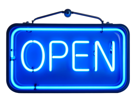 A green, rectangular signboard with the word OPEN in white letters with red outlines. The signboard is hanging from a string and is isolated on a white background. Generative AI