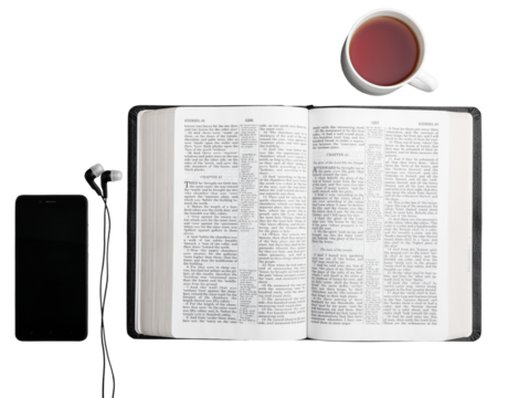 Old Holy Bible, open. Yellow stained pages. Top view, transparent background.