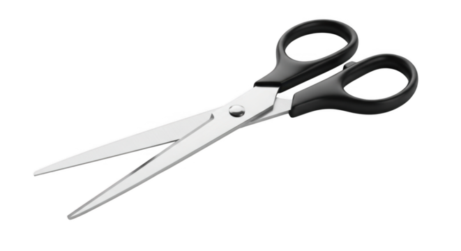 A pair of black handled stainless steel scissors opened wide ready to cut with sharp blades on a black background