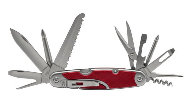 Silver multi-tool with various open blades and tools, useful for camping and survival, cut out, stock png, isolated on transparent background