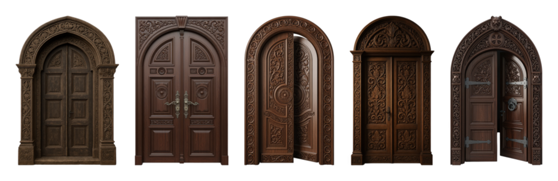 Ornate carved wooden door set including arched and rectangular, closed and open designs isolated. Grand entrance and architectural elements.