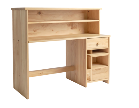 rustic wooden console table with three drawers and open shelf storage made of natural wood furniture on transparent background