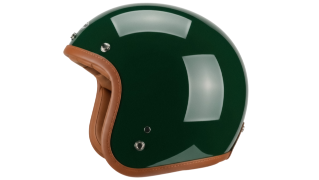 Retro green motorcycle helmet isolated PNG, vintage open face helmet with brown leather trim for biker safety and classic style