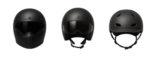 Set of three matte black helmets isolated on transparent background including full face motorcycle helmet open face helmet and casual bike helmet safety gear concept