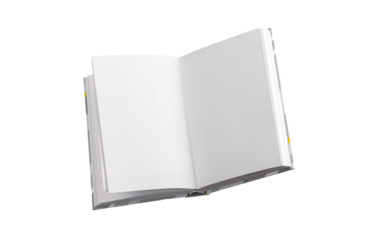 A blank book levitating in the air, showcasing its open, white pages for writing, design, or reading. Perfect for educational materials, publishing, or business presentations. Isolated on background.