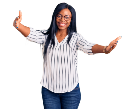 A happy young asian woman sits crosslegged in jeans and a white tshirt, smiling and holding her left hand open with palm facing upwards isolated on transparent background