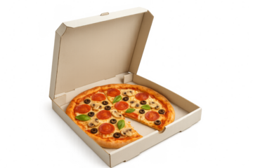 Delicious pepperoni pizza with mushrooms and olives in open cardboard box on transparent background