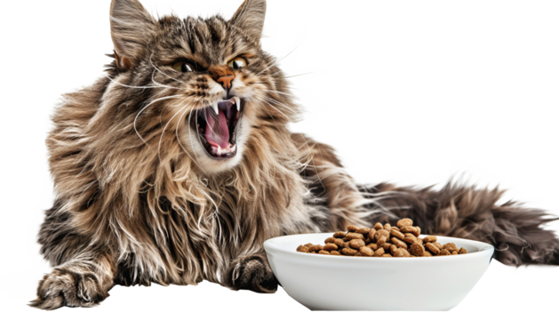 Visualize a high-resolution image of a fluffy Persian cat with its mouth open, positioned near
