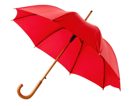 Red umbrella wooden handle curved open isolated transparency background rain protection classic style vibrant accessory