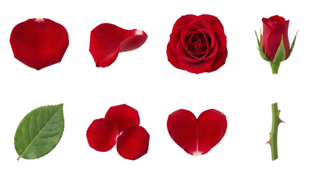 Red rose set including petals, open flower, bud, leaf, and thorny stem isolated. Floral collection for romantic decor and valentines day.