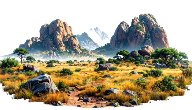A vibrant vista showcases arid, open terrain. Towering rocky formations frame distant peaks. Sparse trees and shrubs dot the landscape