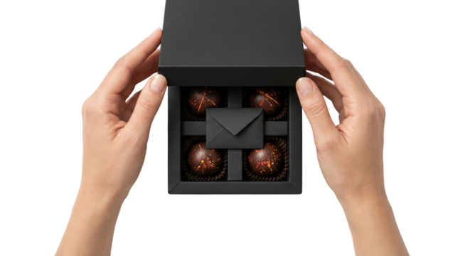 Hands opening a black gift box with gourmet chocolates inside, isolated on white background.