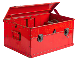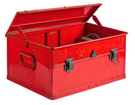 Red metal toolbox standing open, revealing black interior tray, positioned against transparent background