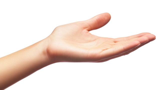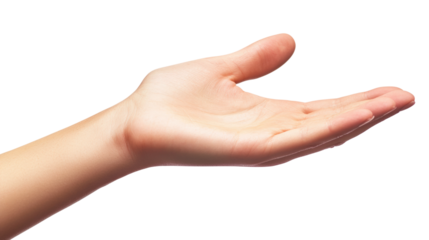 A hand is shown with a white background. The hand is open and the fingers are spread out. Concept of openness and generosity, png
