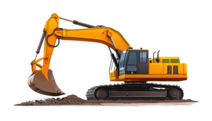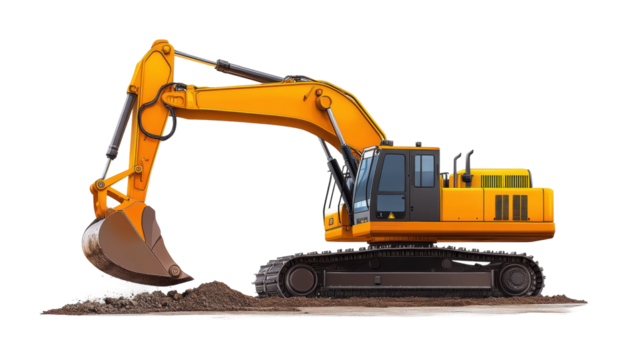 Yellow excavator isolated on transparent background, a powerful construction vehicle used for digging, earthmoving, and heavy lifting in building projects