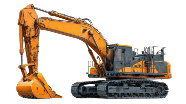 The excavator and loader are positioned in an isolated space, highlighting their design and colors against a clean background, ready for heavy-duty work.