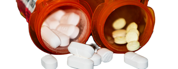 Looking into two prescription pill bottles with white and yellow pills with transparent background
