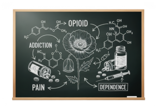 Opioid addiction and dependence chalkboard illustration isolated on transparent background