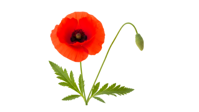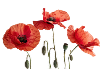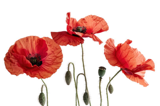Four poppies showcasing various stages of blooming, ranging from closed buds to vibrant full blossoms, isolated on a transparent background, ideal for creative compositions