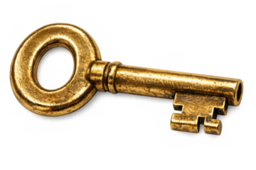 Vintage brass skeleton key representing unlock, access, security, mystery, solution and opportunity on transparent background