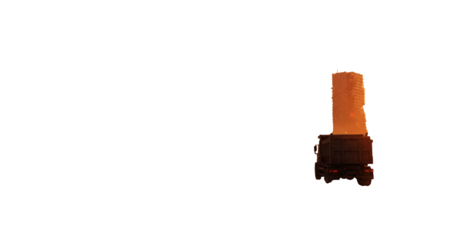 Lone semi-truck on a cracked highway in a ruined cityscape under a dramatic sunset, isolated on a transparent background. Oppressive post-apocalypse atmosphere
