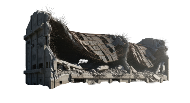 massive brutalist parking garage ruins with crumbling concrete, exposed rusty rebar, set against a transparent background under harsh chiaroscuro lighting, oppressive post-apocalypse atmosphere