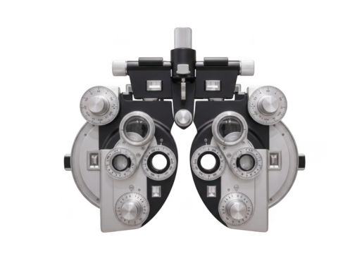 Close up of an ophthalmic phoropter for eye examinations isolated on transparent background