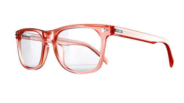 Stylish translucent coral eyeglass frames with clear lenses resting on a reflective surface, perfect for optics stores, vision care advertisements, and fashion accessory promotions.