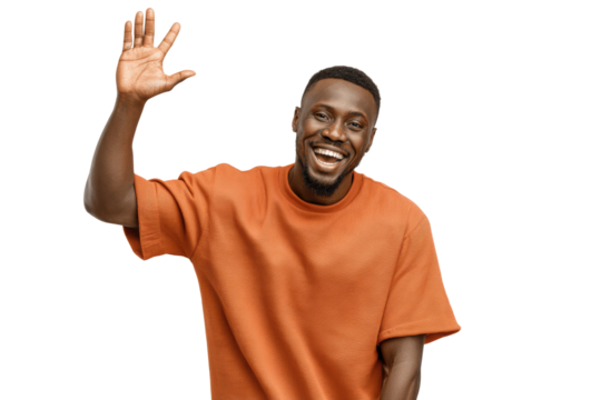 PNG Smiling african male adult waving in orange shirt