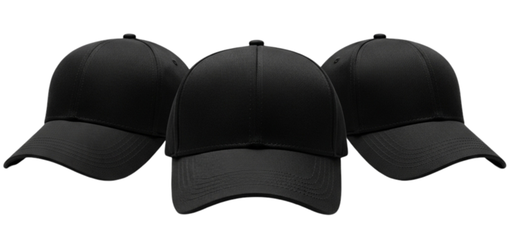 Three black baseball caps arranged in a row, offering a simple and stylish headwear option isolated on transparent background