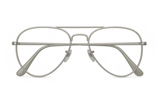 Aviator style eyeglasses with a silver metal frame and clear lenses, a classic eyewear fashion accessory on transparent background