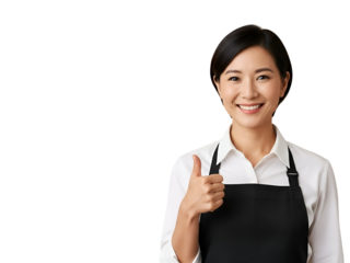 Smiling Asian woman in black apron and white shirt giving thumbs up gesture, representing excellent service and approval, isolated on transparent background.