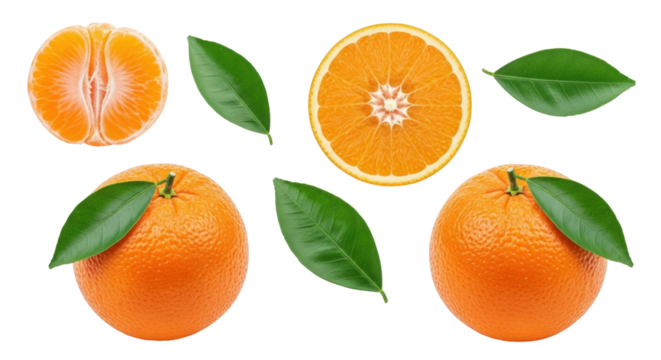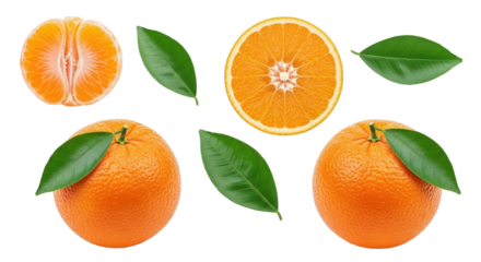 Orange isolated png. Whole orange and a half on transparent background. Orang fruit no background. Full depth of field. Transparent png