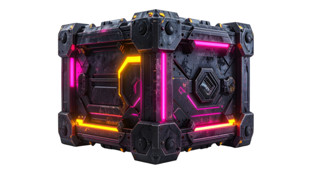 Sci-fi metallic cube with neon highlights and intricate paneling