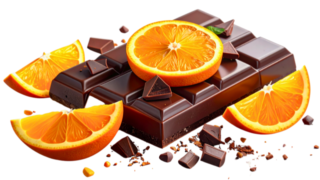 Dark chocolate bar topped with shards and orange slices, isolated on transparent background