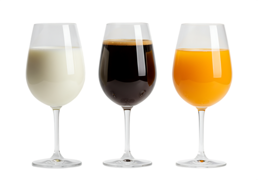 Three wine glasses containing beverages milk coffee and orange juice Isolated on transparent background