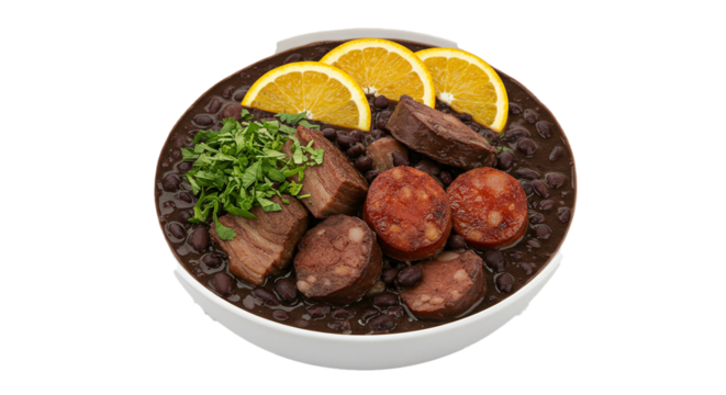 Authentic feijoada recipe brazilian black bean stew with pork sausage and orange slices traditional dish on transparent background