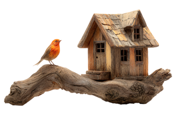 Orange bird on a rustic wooden branch with a miniature house.