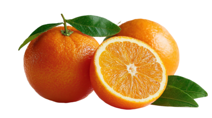 Fresh orange with a green leaf isolated on transparent background, closeup view