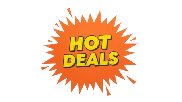 Orange burst with yellow Hot Deals text isolated PNG, promotional graphic for sales and discounts on transparent background