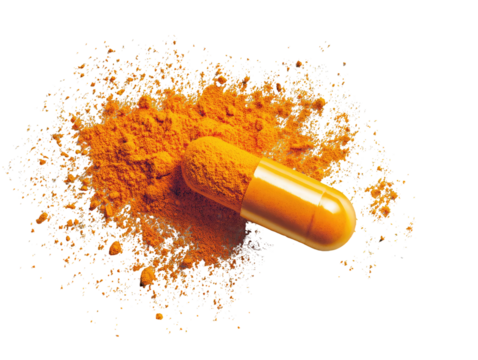 Orange capsule atop turmeric powder