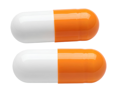 white and orange capsule pills isolated on a transparent background.