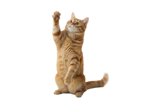 Playful ginger orange cat sits on hind legs raised front paws and looks up  isolated on white background